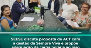 No dia 9 de junho, a diretoria do SEESE participou de uma reunião na sede da entidade com representantes da Sempre Viva, com o objetivo de dar continuidade às tratativas para firmar um Acordo Coletivo de Trabalho (ACT) para os profissionais enfermeiros da instituição. Durante o encontro, a gestão da Sempre Viva apresentou uma proposta de remuneração, no entanto, com …
