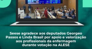 A diretoria do SEESE expressa seu agradecimento público aos deputados estaduais Georgeo Passos (REDE) e Linda Brasil (PSOL) pelo apoio, acolhimento e valorização dos profissionais da saúde, especialmente da enfermagem, durante a votação do Projeto de Lei nº 293/2025, de autoria do Governo Estadual, aprovado nesta quinta-feira (16) na ALESE. O projeto trata da garantia de direitos aos profissionais do …