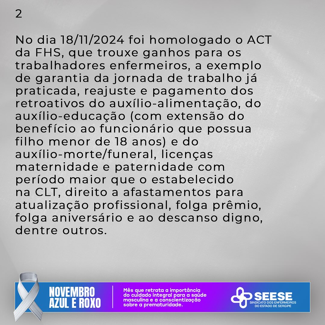 No dia 18/11/2024 foi homologado o ACT da FHS, que trouxe ganhos para os trabalhadores enfermeiros, a exemplo de garantia da jornada de trabalho já praticada, reajuste e pagamento dos retroativos do auxílio-alimentação, do auxílio-educação (com extensão do benefício ao funcionário que possua filho menor de 18 anos) e do auxílio-morte/funeral, licenças maternidade e paternidade com período maior que o estabelecido na CLT, direito a afastamentos para atualização profissional, folga prêmio, folga aniversário e ao descanso digno, dentre outros.