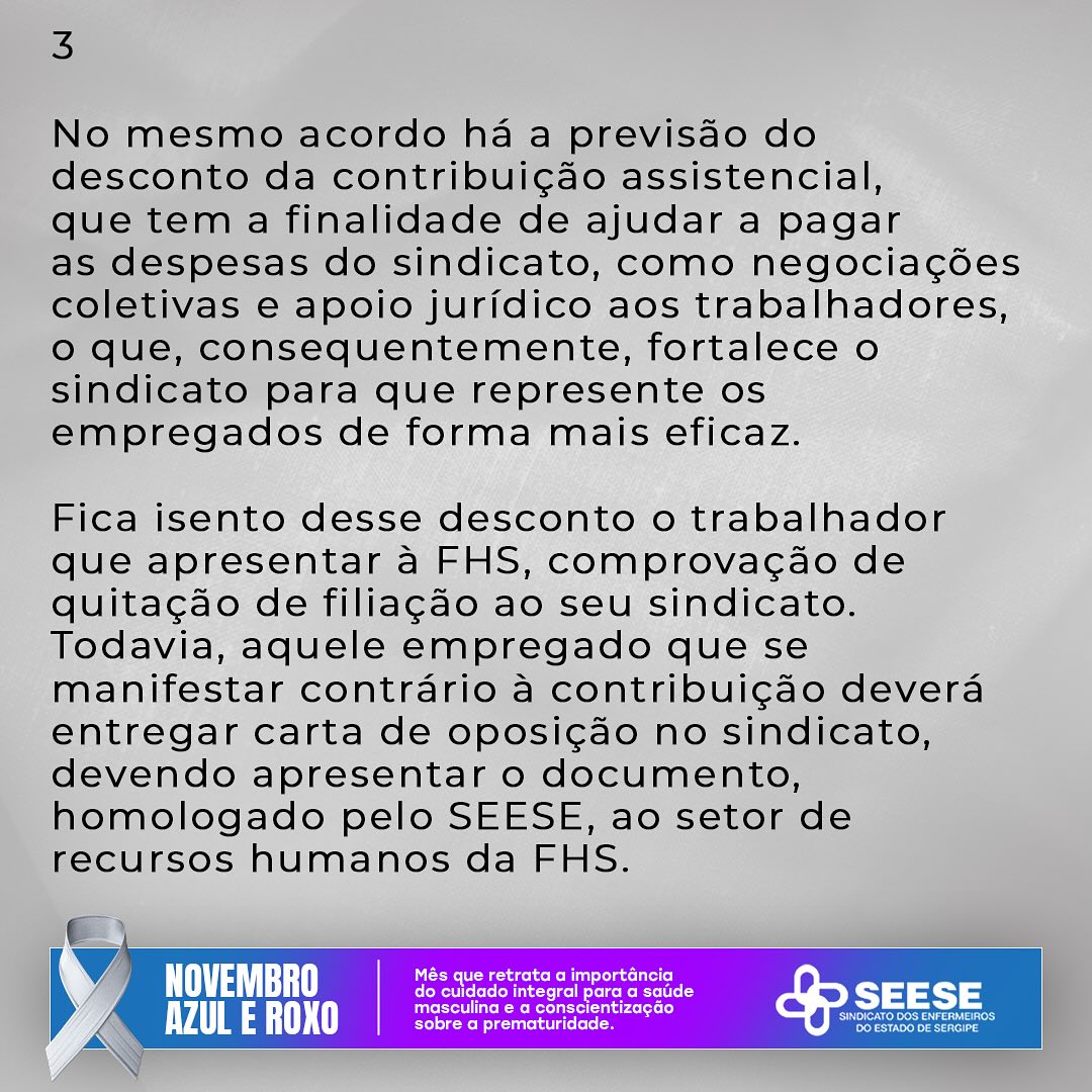 Fica isento desse desconto o trabalhador que apresentar à FHS, comprovação de quitação de filiação ao seu sindicato. Todavia, aquele empregado que se manifestar contrário à contribuição deverá entregar carta de oposição no sindicato, devendo apresentar o documento, homologado pelo SEESE, ao setor de recursos humanos da FHS.