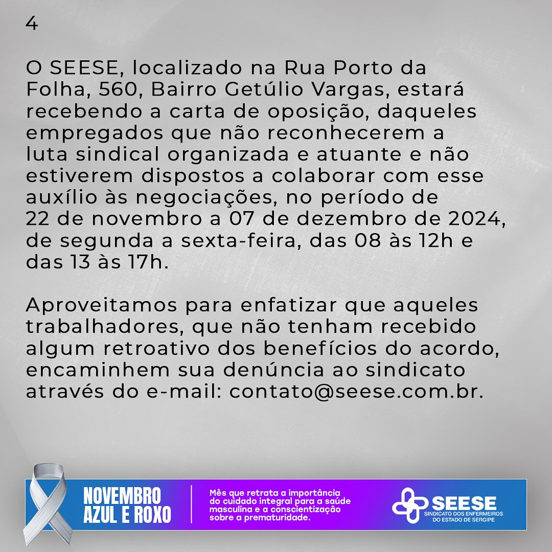O SEESE, localizado na Rua Porto da Folha, 560, Bairro Getúlio Vargas, estará recebendo a carta de oposição, daqueles empregados que não reconhecerem a luta sindical organizada e atuante e não estiverem dispostos a colaborar com esse auxílio às negociações, no período de 22 de novembro a 07 de dezembro de 2024, de segunda a sexta-feira, das 08 às 12h e das 13 às 17h.
