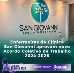 Em assembleia realizada no dia 7 de janeiro, na sede do Seese, a diretoria do sindicato reuniu-se com as enfermeiras da Clínica San Giovanni Especialidades e Vacinas para discutir e aprovar o Acordo Coletivo de Trabalho (ACT) para o período de 2024 a 2026.