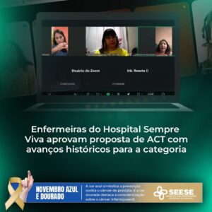 A diretoria do Seese realizou, na noite desta sexta-feira, 05, uma assembleia on-line com as enfermeiras do Hospital Sempre Viva para apreciação da proposta de Acordo Coletivo de Trabalho (ACT) apresentada pela gestão da unidade. A proposta foi aprovada por unanimidade pelas profissionais participantes.