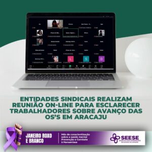 A diretoria do Seese, juntamente com as diretorias do Sindasse, Sinodonto, Sintama, Sinfito-SE, Sindifarma e Sindimed, realizou nesta sexta-feira, dia 13, uma reunião on-line com suas respectivas categorias para discutir o andamento do processo de implantação das Organizações Sociais (OS’s) no município de Aracaju. O encontro teve como objetivo dialogar com os trabalhadores diante do cenário de incertezas e da falta de informações claras por parte da gestão municipal.