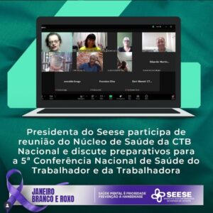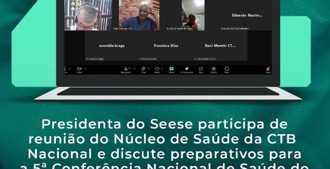No dia 15, a presidenta do Seese, Shirley Morales, participou de uma reunião virtual do Núcleo de Coletivo de Saúde da CTB Nacional. O encontro teve como objetivo alinhar os preparativos para a 5ª Conferência Nacional de Saúde do Trabalhador e da Trabalhadora (5ª CNSTT), que acontecerá em 2025, com o tema central “Saúde do Trabalhador e da Trabalhadora como Direito Humano”.