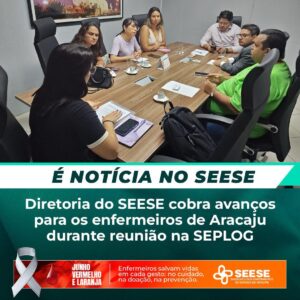 No dia 3 de junho, a diretoria do SEESE participou de uma importante reunião na Secretaria Municipal de Planejamento, Orçamento e Gestão (SEPLOG), em Aracaju. O encontro contou com a presença dos secretários da SEPLOG, da Fazenda e do coordenador jurídico da Secretaria Municipal da Saúde (SMS), e teve como pauta central as reivindicações específicas dos profissionais enfermeiros da rede municipal.