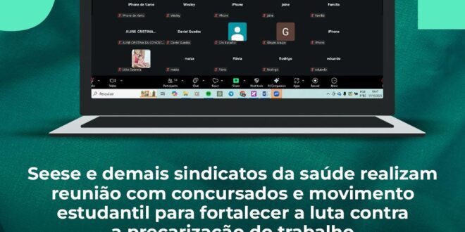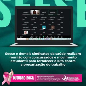 A diretoria do Seese, em conjunto com dirigentes do Sinfito, Sinodonto, Sinpsi, Sindifarma, Sindinutrisse, Sintama e Sindasse, realizou, no dia 17 de outubro, uma reunião online com aprovados no concurso público da Secretaria de Estado da Saúde (SES), além de representantes do movimento estudantil.