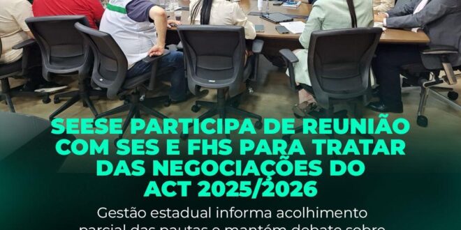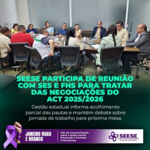 A diretoria do SEESE participou, nesta quinta-feira, dia 22 de janeiro, de uma reunião com a gestão da Secretaria de Estado da Saúde (SES) e da Fundação Hospitalar de Saúde (FHS) para obter uma resposta oficial acerca das negociações do Acordo Coletivo de Trabalho (ACT) 2025/2026.